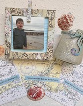 Ahoy! And welcome to a nautical themed workshop for the month of June. This crafting workshop highlights techniques using vintage nautical maps. In this workshop participants create three unique nautical themed cards, an upgraded photo frame using map strips and a summer themed glass candle. Most supplies are included in the workshop fee, but a few you will need to bring: scissors, 12” ruler, liquid glue (Elmer’s white, clear or glue stick, pencil or any items you might want to use to personalize your creations.